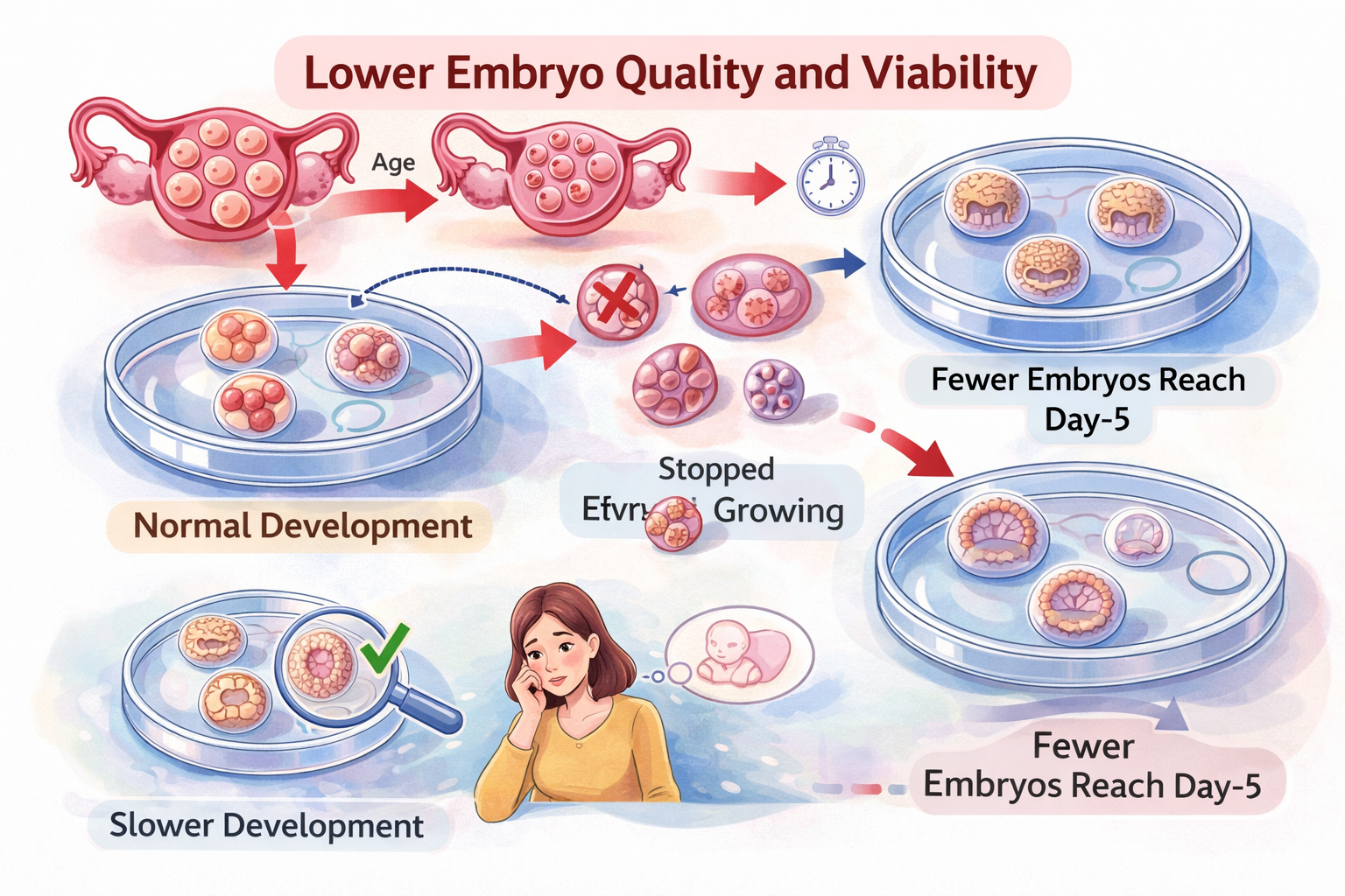 - Fewer embryos reach Day-5 (blastocyst stage)